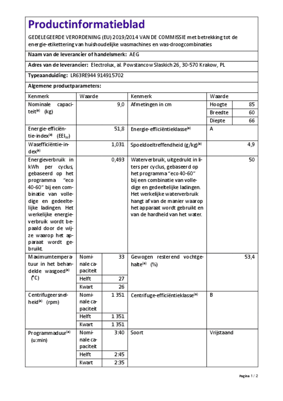 | Toestelcategorie | Wasmachine |